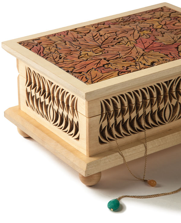 Many first-time chip carvers experience issues with color bleeding out of the chips and into the surrounding wood when staining projects. Here’s what you can do to keep the color inside the chips. Once you master adding color to chip carvings, test it out on some summer-themed coasters. When your carving is finished, first seal the wood completely. Apply several light coats of spray satin lacquer, matte acrylic, or shellac-based sanding sealer to the entire carving—front, back, and edges. If your carved item is quite thin, avoid a penetrating sealer, as this will cause the wood to cup. With the wood properly sealed, brush a gel stain into the recesses of your carving and wipe off the surface with a cotton cloth. Gel stains do not absorb into the wood like penetrating oil stains. Let the stain dry overnight and spray on a final topcoat to complete the finish. |